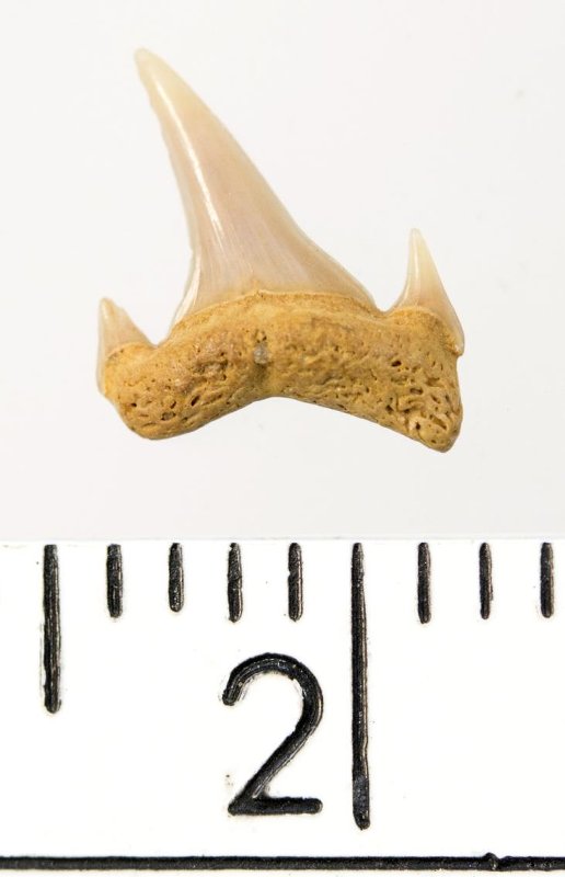 Мелкий боковой зуб с коронкой серого цвета, колюще-режущего типа, S-образно изогнутой, с гладким режущим краем. С лингвальной стороны у основания коронки на эмали имеется скульптура в виде слабой продольной струйчатости. Корень охристый, арочный, умеренно массивный, со следами окатанности. Имеются питательная борозда с лингвальной стороны корня и одна пара добавочных зубцов коронки.