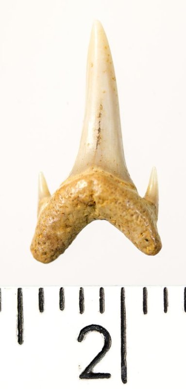 Мелкий боковой зуб с коронкой серого цвета, колюще-режущего типа, S-образно изогнутой, с гладким режущим краем. С лингвальной стороны у основания коронки на эмали имеется скульптура в виде слабой продольной струйчатости. Корень охристый, арочный, умеренно массивный, со следами окатанности. Имеются питательная борозда с лингвальной стороны корня и одна пара добавочных зубцов коронки.