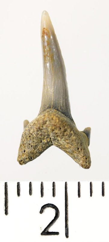 Мелкий боковой зуб с коронкой серого цвета, колюще-режущего типа, S-образно изогнутой, с гладким режущим краем. С лингвальной стороны у основания коронки на эмали имеется скульптура в виде слабой продольной струйчатости. Корень охристый, арочный, умеренно массивный, со следами окатанности. Имеются питательная борозда с лингвальной стороны корня и одна пара добавочных зубцов коронки.
