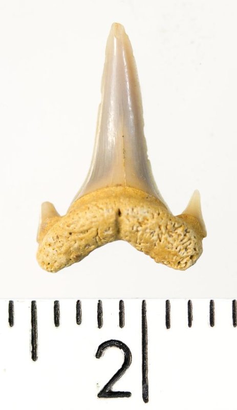 Мелкий боковой зуб с коронкой серого цвета, колюще-режущего типа, S-образно изогнутой, с гладким режущим краем. С лингвальной стороны у основания коронки на эмали имеется скульптура в виде слабой продольной струйчатости. Корень охристый, арочный, умеренно массивный, со следами окатанности. Имеются питательная борозда с лингвальной стороны корня и одна пара добавочных зубцов коронки.