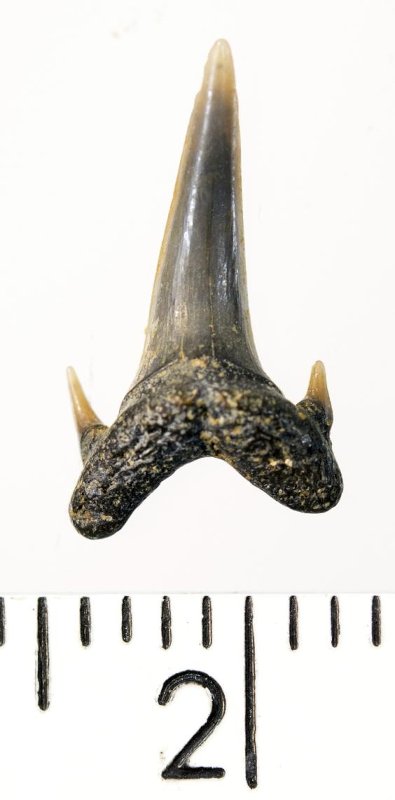 Мелкий боковой зуб с коронкой серого цвета, колюще-режущего типа, S-образно изогнутой, с гладким режущим краем. С лингвальной стороны у основания коронки на эмали имеется скульптура в виде слабой продольной струйчатости. Корень охристый, арочный, умеренно массивный, со следами окатанности. Имеются питательная борозда с лингвальной стороны корня и одна пара добавочных зубцов коронки.