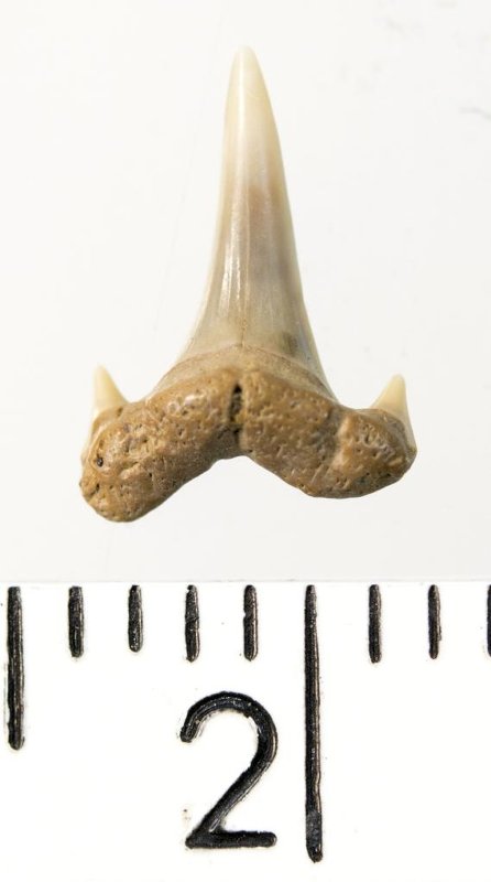 Мелкий боковой зуб с коронкой серого цвета, колюще-режущего типа, S-образно изогнутой, с гладким режущим краем. С лингвальной стороны у основания коронки на эмали имеется скульптура в виде слабой продольной струйчатости. Корень охристый, арочный, умеренно массивный, со следами окатанности. Имеются питательная борозда с лингвальной стороны корня и одна пара добавочных зубцов коронки.