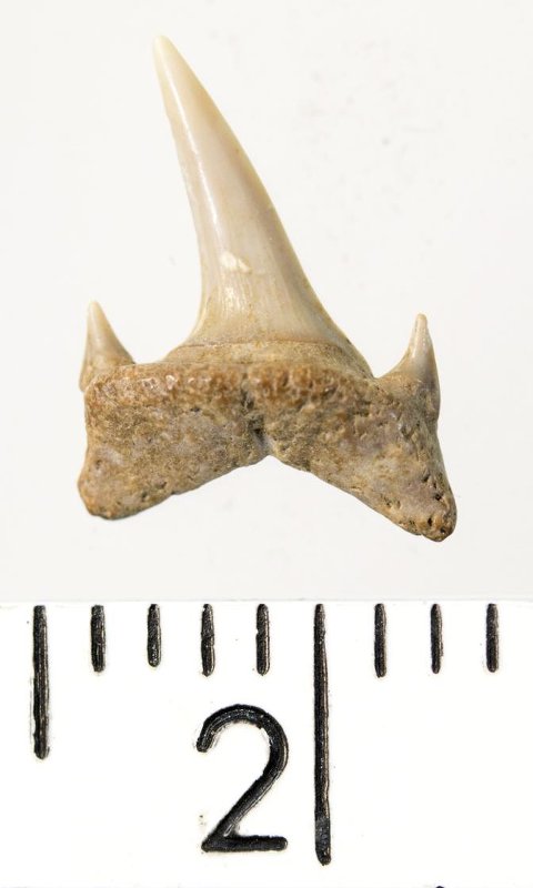 Мелкий боковой зуб с коронкой серого цвета, колюще-режущего типа, S-образно изогнутой, с гладким режущим краем. С лингвальной стороны у основания коронки на эмали имеется скульптура в виде слабой продольной струйчатости. Корень охристый, арочный, умеренно массивный, со следами окатанности. Имеются питательная борозда с лингвальной стороны корня и одна пара добавочных зубцов коронки.