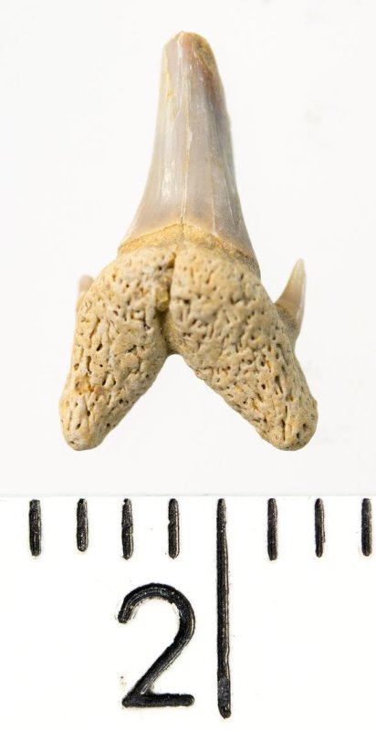 Мелкий боковой зуб с коронкой серого цвета, колюще-режущего типа, S-образно изогнутой, с гладким режущим краем. С лингвальной стороны у основания коронки на эмали имеется скульптура в виде слабой продольной струйчатости. Корень охристый, арочный, умеренно массивный, со следами окатанности. Имеются питательная борозда с лингвальной стороны корня и одна пара добавочных зубцов коронки.