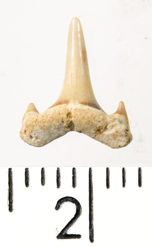 Мелкий боковой зуб с коронкой серого цвета, колюще-режущего типа, S-образно изогнутой, с гладким режущим краем. С лингвальной стороны у основания коронки на эмали имеется скульптура в виде слабой продольной струйчатости. Корень охристый, арочный, умеренно массивный, со следами окатанности. Имеются питательная борозда с лингвальной стороны корня и одна пара добавочных зубцов коронки.