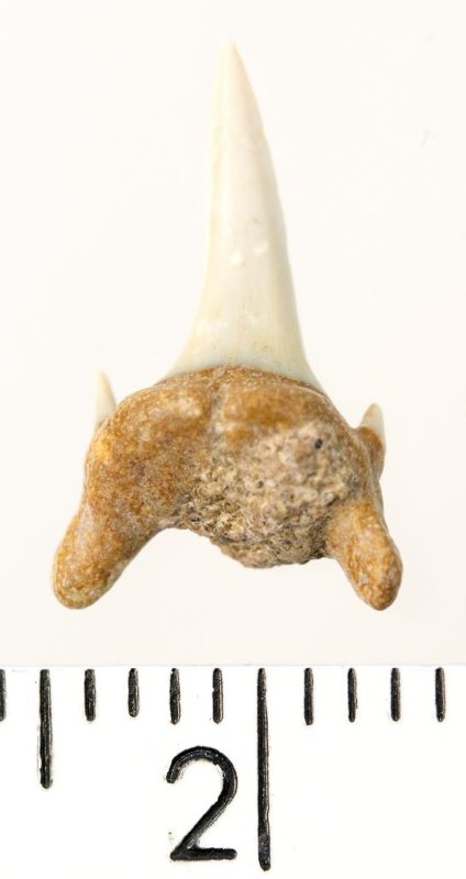 Мелкий боковой зуб с коронкой серого цвета, колюще-режущего типа, S-образно изогнутой, с гладким режущим краем. С лингвальной стороны у основания коронки на эмали имеется скульптура в виде слабой продольной струйчатости. Корень охристый, арочный, умеренно массивный, со следами окатанности. Имеются питательная борозда с лингвальной стороны корня и одна пара добавочных зубцов коронки.
