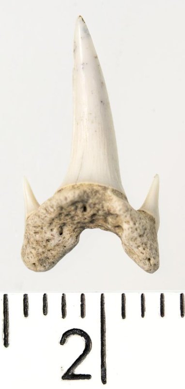 Мелкий боковой зуб с коронкой серого цвета, колюще-режущего типа, S-образно изогнутой, с гладким режущим краем. С лингвальной стороны у основания коронки на эмали имеется скульптура в виде слабой продольной струйчатости. Корень охристый, арочный, умеренно массивный, со следами окатанности. Имеются питательная борозда с лингвальной стороны корня и одна пара добавочных зубцов коронки.