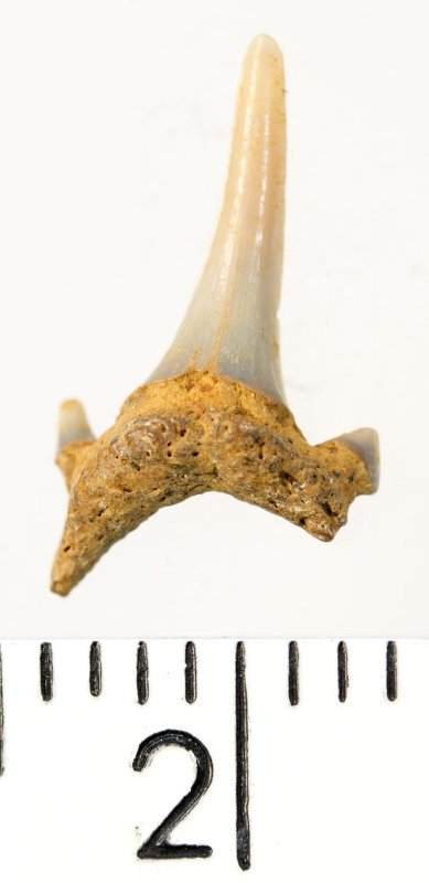 Мелкий боковой зуб с коронкой серого цвета, колюще-режущего типа, S-образно изогнутой, с гладким режущим краем. С лингвальной стороны у основания коронки на эмали имеется скульптура в виде слабой продольной струйчатости. Корень охристый, арочный, умеренно массивный, со следами окатанности. Имеются питательная борозда с лингвальной стороны корня и одна пара добавочных зубцов коронки.
