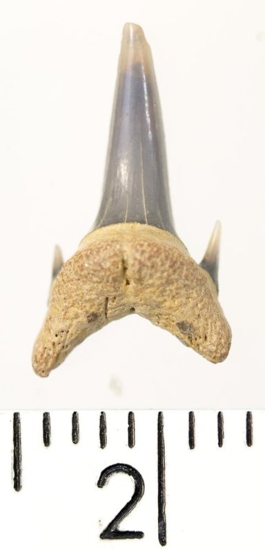 Мелкий боковой зуб с коронкой серого цвета, колюще-режущего типа, S-образно изогнутой, с гладким режущим краем. С лингвальной стороны у основания коронки на эмали имеется скульптура в виде слабой продольной струйчатости. Корень охристый, арочный, умеренно массивный, со следами окатанности. Имеются питательная борозда с лингвальной стороны корня и одна пара добавочных зубцов коронки.