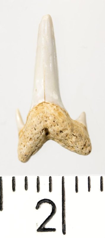 Мелкий боковой зуб с коронкой серого цвета, колюще-режущего типа, S-образно изогнутой, с гладким режущим краем. С лингвальной стороны у основания коронки на эмали имеется скульптура в виде слабой продольной струйчатости. Корень охристый, арочный, умеренно массивный, со следами окатанности. Имеются питательная борозда с лингвальной стороны корня и одна пара добавочных зубцов коронки.