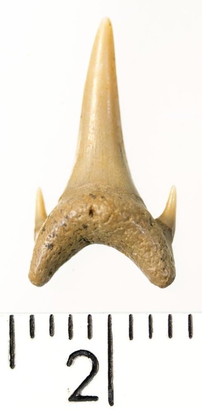 Зуб. Акула. Eostriatolamia subulata (Agassiz, 1843). Классификация: Хордовые Chordata, Позвоночные Vertebrata, Хрящевые рыбы Chondrichthyes, Пластиножаберные Elasmobranchii, Акулы Selachii, Ламнообразные Lamniformes, Песчаные акулы Odontaspididae