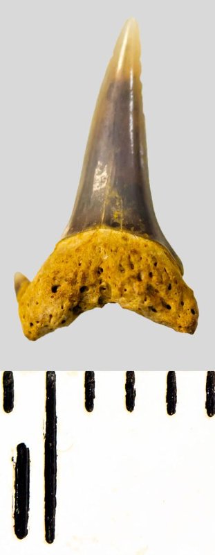 Мелкий боковой зуб с коронкой серого цвета, колюще-режущего типа, S-образно изогнутой, с гладким режущим краем. С лингвальной стороны у основания коронки на эмали имеется скульптура в виде слабой продольной струйчатости. Корень охристый, арочный, умеренно массивный, со следами окатанности. Имеется одна питательная борозда с лингвальной стороны корня. Имелась одна пара добавочных зубцов коронки, сохранился только левый.