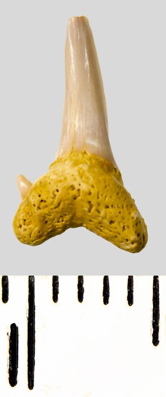 Мелкий боковой зуб с коронкой серого цвета, колюще-режущего типа, S-образно изогнутой, с гладким режущим краем. С лингвальной стороны у основания коронки на эмали имеется скульптура в виде слабой продольной струйчатости. Корень охристый, арочный, умеренно массивный, со следами окатанности. Имеется одна питательная борозда с лингвальной стороны корня. Имелась одна пара добавочных зубцов коронки, сохранился только левый.