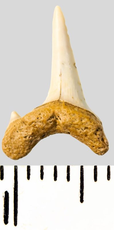 Мелкий боковой зуб с коронкой серого цвета, колюще-режущего типа, S-образно изогнутой, с гладким режущим краем. С лингвальной стороны у основания коронки на эмали имеется скульптура в виде слабой продольной струйчатости. Корень охристый, арочный, умеренно массивный, со следами окатанности. Имеется одна питательная борозда с лингвальной стороны корня. Имелась одна пара добавочных зубцов коронки, сохранился только левый.