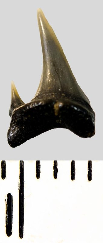 Мелкий боковой зуб с коронкой серого цвета, колюще-режущего типа, S-образно изогнутой, с гладким режущим краем. С лингвальной стороны у основания коронки на эмали имеется скульптура в виде слабой продольной струйчатости. Корень охристый, арочный, умеренно массивный, со следами окатанности. Имеется одна питательная борозда с лингвальной стороны корня. Имелась одна пара добавочных зубцов коронки, сохранился только левый.