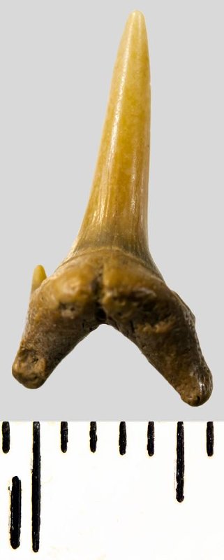 Мелкий боковой зуб с коронкой серого цвета, колюще-режущего типа, S-образно изогнутой, с гладким режущим краем. С лингвальной стороны у основания коронки на эмали имеется скульптура в виде слабой продольной струйчатости. Корень охристый, арочный, умеренно массивный, со следами окатанности. Имеется одна питательная борозда с лингвальной стороны корня. Имелась одна пара добавочных зубцов коронки, сохранился только левый.