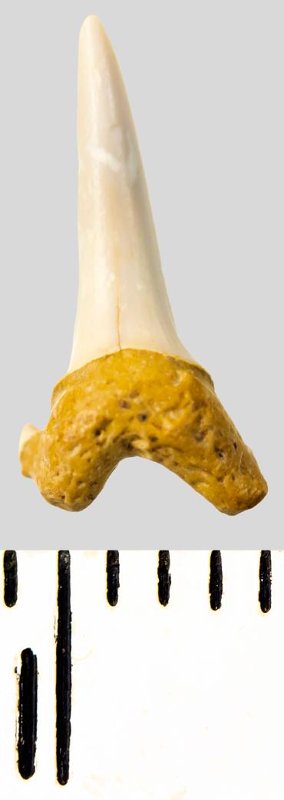 Мелкий боковой зуб с коронкой серого цвета, колюще-режущего типа, S-образно изогнутой, с гладким режущим краем. С лингвальной стороны у основания коронки на эмали имеется скульптура в виде слабой продольной струйчатости. Корень охристый, арочный, умеренно массивный, со следами окатанности. Имеется одна питательная борозда с лингвальной стороны корня. Имелась одна пара добавочных зубцов коронки, сохранился только левый.
