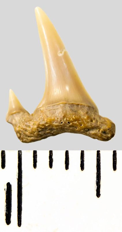 Мелкий боковой зуб с коронкой серого цвета, колюще-режущего типа, S-образно изогнутой, с гладким режущим краем. С лингвальной стороны у основания коронки на эмали имеется скульптура в виде слабой продольной струйчатости. Корень охристый, арочный, умеренно массивный, со следами окатанности. Имеется одна питательная борозда с лингвальной стороны корня. Имелась одна пара добавочных зубцов коронки, сохранился только левый.