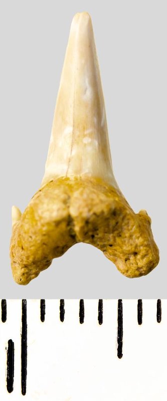 Мелкий боковой зуб с коронкой серого цвета, колюще-режущего типа, S-образно изогнутой, с гладким режущим краем. С лингвальной стороны у основания коронки на эмали имеется скульптура в виде слабой продольной струйчатости. Корень охристый, арочный, умеренно массивный, со следами окатанности. Имеется одна питательная борозда с лингвальной стороны корня. Имелась одна пара добавочных зубцов коронки, сохранился только левый.