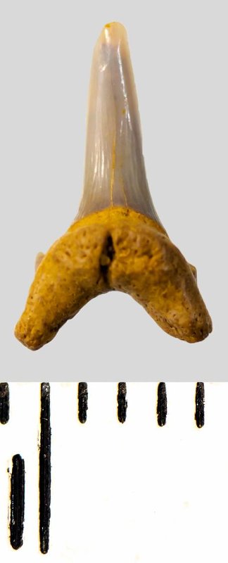 Мелкий боковой зуб с коронкой серого цвета, колюще-режущего типа, S-образно изогнутой, с гладким режущим краем. С лингвальной стороны у основания коронки на эмали имеется скульптура в виде слабой продольной струйчатости. Корень охристый, арочный, умеренно массивный, со следами окатанности. Имеется одна питательная борозда с лингвальной стороны корня. Имелась одна пара добавочных зубцов коронки, сохранился только левый.