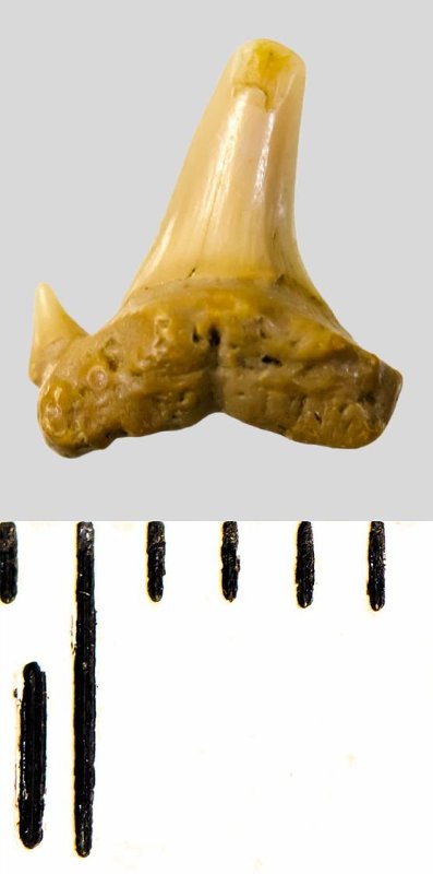 Мелкий боковой зуб с коронкой серого цвета, колюще-режущего типа, S-образно изогнутой, с гладким режущим краем. С лингвальной стороны у основания коронки на эмали имеется скульптура в виде слабой продольной струйчатости. Корень охристый, арочный, умеренно массивный, со следами окатанности. Имеется одна питательная борозда с лингвальной стороны корня. Имелась одна пара добавочных зубцов коронки, сохранился только левый.