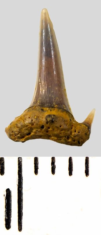 Мелкий боковой зуб с коронкой серого цвета, колюще-режущего типа, S-образно изогнутой, с гладким режущим краем. С лингвальной стороны у основания коронки на эмали имеется скульптура в виде слабой продольной струйчатости. Корень охристый, арочный, умеренно массивный, со следами окатанности. Имеется одна питательная борозда с лингвальной стороны корня. Имелась одна пара добавочных зубцов коронки, сохранился только правый.