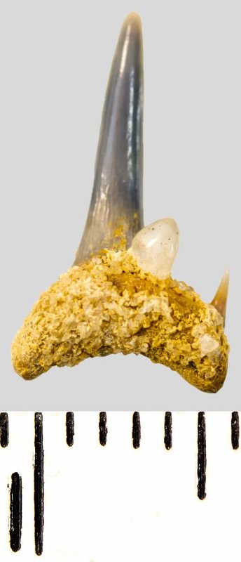 Мелкий боковой зуб с коронкой серого цвета, колюще-режущего типа, S-образно изогнутой, с гладким режущим краем. С лингвальной стороны у основания коронки на эмали имеется скульптура в виде слабой продольной струйчатости. Корень охристый, арочный, умеренно массивный, со следами окатанности. Имеется одна питательная борозда с лингвальной стороны корня. Имелась одна пара добавочных зубцов коронки, сохранился только правый.