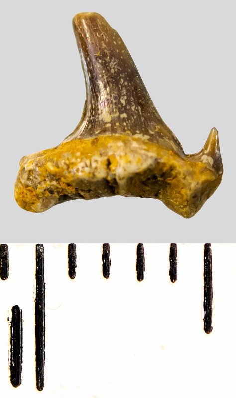 Мелкий боковой зуб с коронкой серого цвета, колюще-режущего типа, S-образно изогнутой, с гладким режущим краем. С лингвальной стороны у основания коронки на эмали имеется скульптура в виде слабой продольной струйчатости. Корень охристый, арочный, умеренно массивный, со следами окатанности. Имеется одна питательная борозда с лингвальной стороны корня. Имелась одна пара добавочных зубцов коронки, сохранился только правый.
