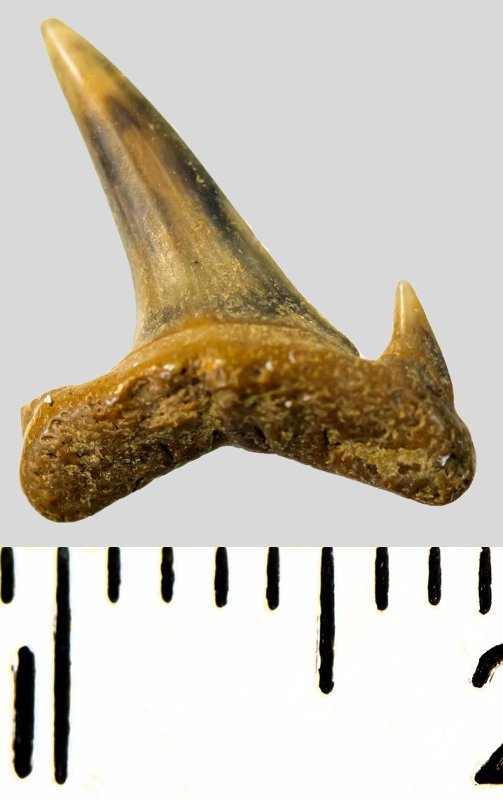 Мелкий боковой зуб с коронкой серого цвета, колюще-режущего типа, S-образно изогнутой, с гладким режущим краем. С лингвальной стороны у основания коронки на эмали имеется скульптура в виде слабой продольной струйчатости. Корень охристый, арочный, умеренно массивный, со следами окатанности. Имеется одна питательная борозда с лингвальной стороны корня. Имелась одна пара добавочных зубцов коронки, сохранился только правый.