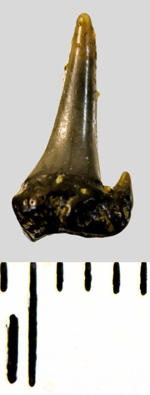 Мелкий боковой зуб с коронкой серого цвета, колюще-режущего типа, S-образно изогнутой, с гладким режущим краем. С лингвальной стороны у основания коронки на эмали имеется скульптура в виде слабой продольной струйчатости. Корень охристый, арочный, умеренно массивный, со следами окатанности. Имеется одна питательная борозда с лингвальной стороны корня. Имелась одна пара добавочных зубцов коронки, сохранился только правый.