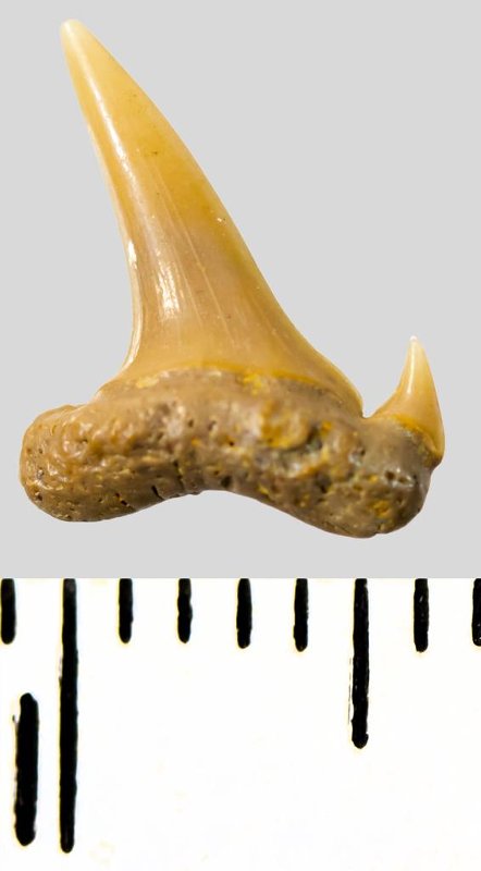 Мелкий боковой зуб с коронкой серого цвета, колюще-режущего типа, S-образно изогнутой, с гладким режущим краем. С лингвальной стороны у основания коронки на эмали имеется скульптура в виде слабой продольной струйчатости. Корень охристый, арочный, умеренно массивный, со следами окатанности. Имеется одна питательная борозда с лингвальной стороны корня. Имелась одна пара добавочных зубцов коронки, сохранился только правый.