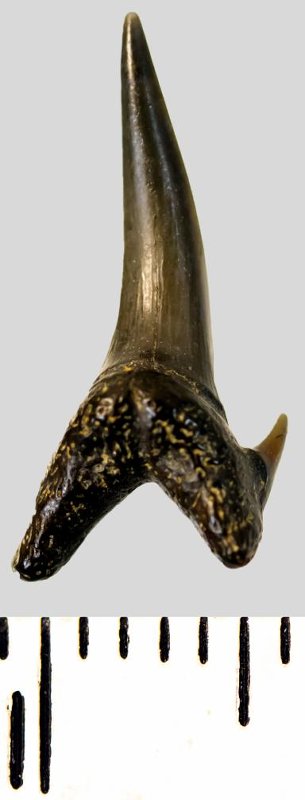 Мелкий боковой зуб с коронкой серого цвета, колюще-режущего типа, S-образно изогнутой, с гладким режущим краем. С лингвальной стороны у основания коронки на эмали имеется скульптура в виде слабой продольной струйчатости. Корень охристый, арочный, умеренно массивный, со следами окатанности. Имеется одна питательная борозда с лингвальной стороны корня. Имелась одна пара добавочных зубцов коронки, сохранился только правый.