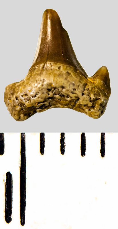 Мелкий боковой зуб с коронкой серого цвета, колюще-режущего типа, S-образно изогнутой, с гладким режущим краем. С лингвальной стороны у основания коронки на эмали имеется скульптура в виде слабой продольной струйчатости. Корень охристый, арочный, умеренно массивный, со следами окатанности. Имеется одна питательная борозда с лингвальной стороны корня. Имелась одна пара добавочных зубцов коронки, сохранился только правый.