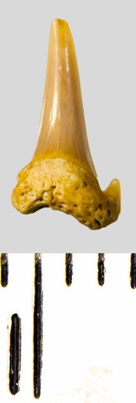Мелкий боковой зуб с коронкой серого цвета, колюще-режущего типа, S-образно изогнутой, с гладким режущим краем. С лингвальной стороны у основания коронки на эмали имеется скульптура в виде слабой продольной струйчатости. Корень охристый, арочный, умеренно массивный, со следами окатанности. Имеется одна питательная борозда с лингвальной стороны корня. Имелась одна пара добавочных зубцов коронки, сохранился только правый.