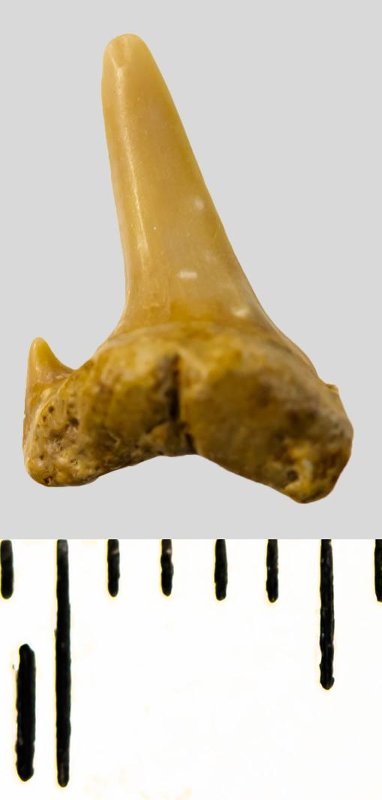 Мелкий боковой зуб с коронкой серого цвета, колюще-режущего типа, S-образно изогнутой, с гладким режущим краем. С лингвальной стороны у основания коронки на эмали имеется скульптура в виде слабой продольной струйчатости. Корень охристый, арочный, умеренно массивный, со следами окатанности. Имеется одна питательная борозда с лингвальной стороны корня. Имелась одна пара добавочных зубцов коронки, сохранился только левый.