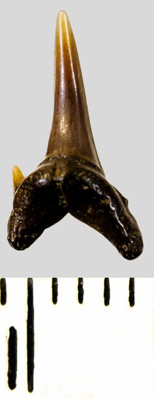 Мелкий боковой зуб с коронкой серого цвета, колюще-режущего типа, S-образно изогнутой, с гладким режущим краем. С лингвальной стороны у основания коронки на эмали имеется скульптура в виде слабой продольной струйчатости. Корень охристый, арочный, умеренно массивный, со следами окатанности. Имеется одна питательная борозда с лингвальной стороны корня. Имелась одна пара добавочных зубцов коронки, сохранился только левый.