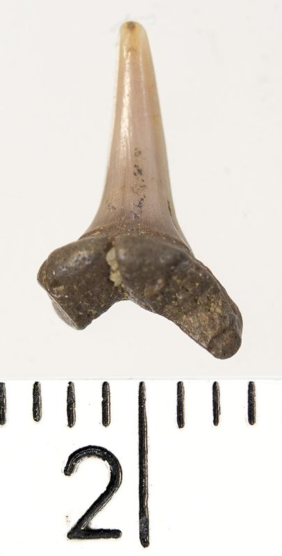 Мелкий боковой зуб с коронкой рыжевато-бежевого цвета, колюще-режущего типа, S-образно изогнутой, с гладким режущим краем. С лингвальной стороны у основания коронки на эмали имеется скульптура в виде слабой продольной струйчатости. Корень бурый, арочный, умеренно массивный, со следами окатанности. Имеется одна питательная борозда с лингвальной стороны корня. Добавочные зубцы коронки зуба отсутствуют.