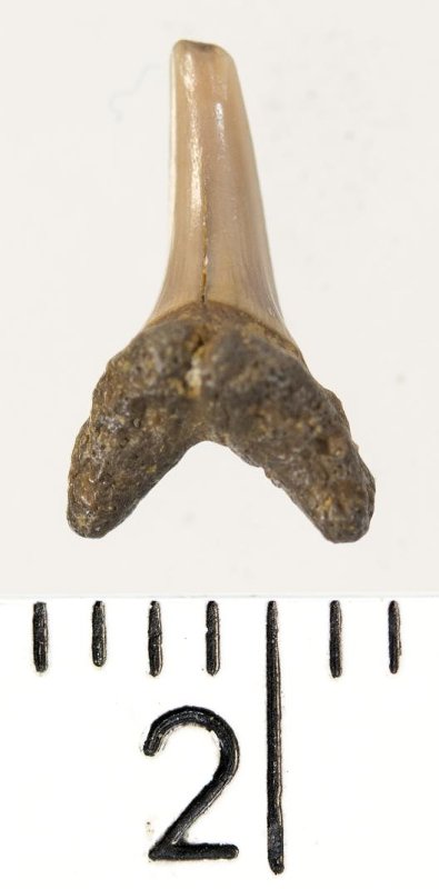 Мелкий боковой зуб с коронкой рыжевато-бежевого цвета, колюще-режущего типа, S-образно изогнутой, с гладким режущим краем. С лингвальной стороны у основания коронки на эмали имеется скульптура в виде слабой продольной струйчатости. Корень бурый, арочный, умеренно массивный, со следами окатанности. Имеется одна питательная борозда с лингвальной стороны корня. Добавочные зубцы коронки зуба отсутствуют.