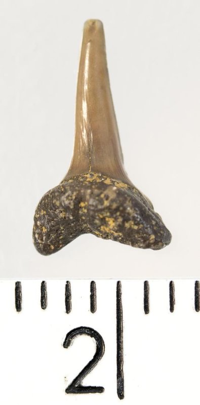 Мелкий боковой зуб с коронкой рыжевато-бежевого цвета, колюще-режущего типа, S-образно изогнутой, с гладким режущим краем. С лингвальной стороны у основания коронки на эмали имеется скульптура в виде слабой продольной струйчатости. Корень бурый, арочный, умеренно массивный, со следами окатанности. Имеется одна питательная борозда с лингвальной стороны корня. Добавочные зубцы коронки зуба отсутствуют.