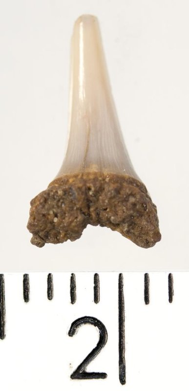 Зуб. Акула. Eostriatolamia subulata (Agassiz, 1843). Классификация: Хордовые Chordata, Позвоночные Vertebrata, Хрящевые рыбы Chondrichthyes, Пластиножаберные Elasmobranchii, Акулы Selachii, Ламнообразные Lamniformes, Песчаные акулы Odontaspididae