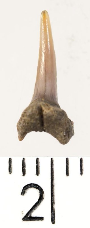 Мелкий боковой зуб с коронкой рыжевато-бежевого цвета, колюще-режущего типа, S-образно изогнутой, с гладким режущим краем. С лингвальной стороны у основания коронки на эмали имеется скульптура в виде слабой продольной струйчатости. Корень бурый, арочный, умеренно массивный, со следами окатанности. Имеется одна питательная борозда с лингвальной стороны корня. Добавочные зубцы коронки зуба отсутствуют.