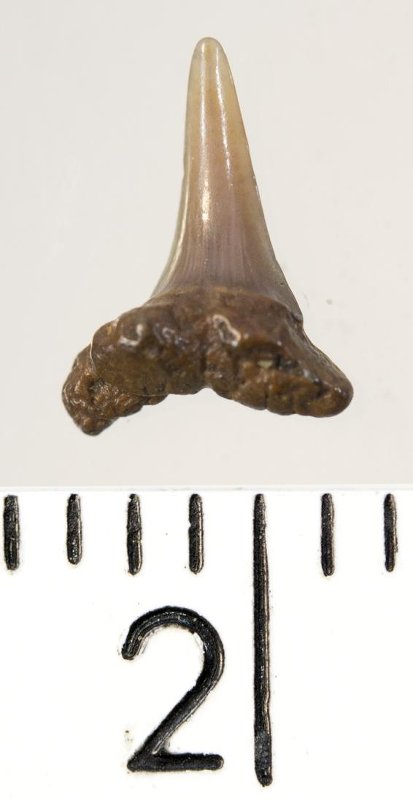Мелкий боковой зуб с коронкой рыжевато-бежевого цвета, колюще-режущего типа, S-образно изогнутой, с гладким режущим краем. С лингвальной стороны у основания коронки на эмали имеется скульптура в виде слабой продольной струйчатости. Корень бурый, арочный, умеренно массивный, со следами окатанности. Имеется одна питательная борозда с лингвальной стороны корня. Добавочные зубцы коронки зуба отсутствуют.