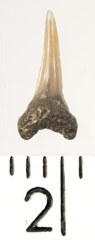 Мелкий боковой зуб с коронкой рыжевато-бежевого цвета, колюще-режущего типа, S-образно изогнутой, с гладким режущим краем. С лингвальной стороны у основания коронки на эмали имеется скульптура в виде слабой продольной струйчатости. Корень бурый, арочный, умеренно массивный, со следами окатанности. Имеется одна питательная борозда с лингвальной стороны корня. Добавочные зубцы коронки зуба отсутствуют.