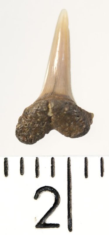 Мелкий боковой зуб с коронкой рыжевато-бежевого цвета, колюще-режущего типа, S-образно изогнутой, с гладким режущим краем. С лингвальной стороны у основания коронки на эмали имеется скульптура в виде слабой продольной струйчатости. Корень бурый, арочный, умеренно массивный, со следами окатанности. Имеется одна питательная борозда с лингвальной стороны корня. Добавочные зубцы коронки зуба отсутствуют.