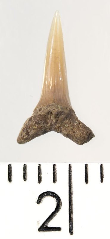 Мелкий боковой зуб с коронкой рыжевато-бежевого цвета, колюще-режущего типа, S-образно изогнутой, с гладким режущим краем. С лингвальной стороны у основания коронки на эмали имеется скульптура в виде слабой продольной струйчатости. Корень бурый, арочный, умеренно массивный, со следами окатанности. Имеется одна питательная борозда с лингвальной стороны корня. Добавочные зубцы коронки зуба отсутствуют.