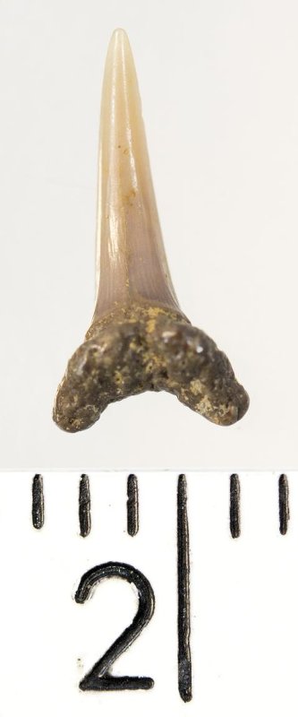 Зуб. Акула. Eostriatolamia subulata (Agassiz, 1843). Классификация: Хордовые Chordata, Позвоночные Vertebrata, Хрящевые рыбы Chondrichthyes, Пластиножаберные Elasmobranchii, Акулы Selachii, Ламнообразные Lamniformes, Песчаные акулы Odontaspididae