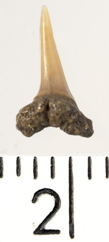 Мелкий боковой зуб с коронкой рыжевато-бежевого цвета, колюще-режущего типа, S-образно изогнутой, с гладким режущим краем. С лингвальной стороны у основания коронки на эмали имеется скульптура в виде слабой продольной струйчатости. Корень бурый, арочный, умеренно массивный, со следами окатанности. Имеется одна питательная борозда с лингвальной стороны корня. Добавочные зубцы коронки зуба отсутствуют.