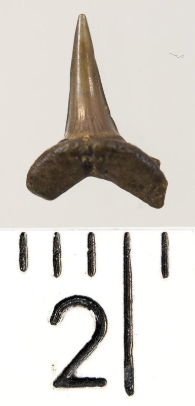 Мелкий боковой зуб с коронкой рыжевато-бежевого цвета, колюще-режущего типа, S-образно изогнутой, с гладким режущим краем. С лингвальной стороны у основания коронки на эмали имеется скульптура в виде слабой продольной струйчатости. Корень бурый, арочный, умеренно массивный, со следами окатанности. Имеется одна питательная борозда с лингвальной стороны корня. Добавочные зубцы коронки зуба отсутствуют.