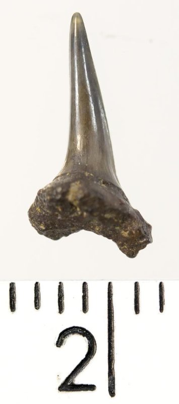 Зуб. Акула. Eostriatolamia subulata (Agassiz, 1843). Классификация: Хордовые Chordata, Позвоночные Vertebrata, Хрящевые рыбы Chondrichthyes, Пластиножаберные Elasmobranchii, Акулы Selachii, Ламнообразные Lamniformes, Песчаные акулы Odontaspididae