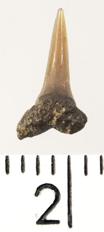 Мелкий боковой зуб с коронкой рыжевато-бежевого цвета, колюще-режущего типа, S-образно изогнутой, с гладким режущим краем. С лингвальной стороны у основания коронки на эмали имеется скульптура в виде слабой продольной струйчатости. Корень бурый, арочный, умеренно массивный, со следами окатанности. Имеется одна питательная борозда с лингвальной стороны корня. Добавочные зубцы коронки зуба отсутствуют.
